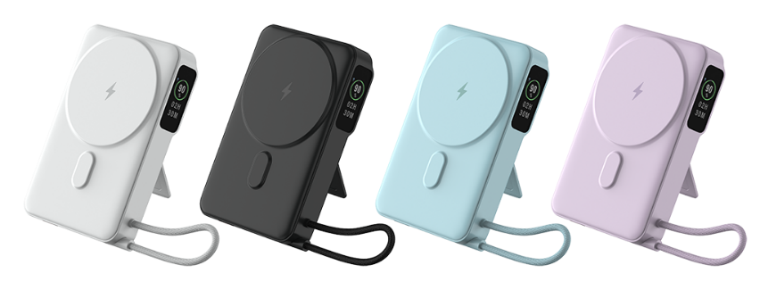 10000mAh PD Magnetic wireless power bank with TFT screen, integrated cable and foldable stand